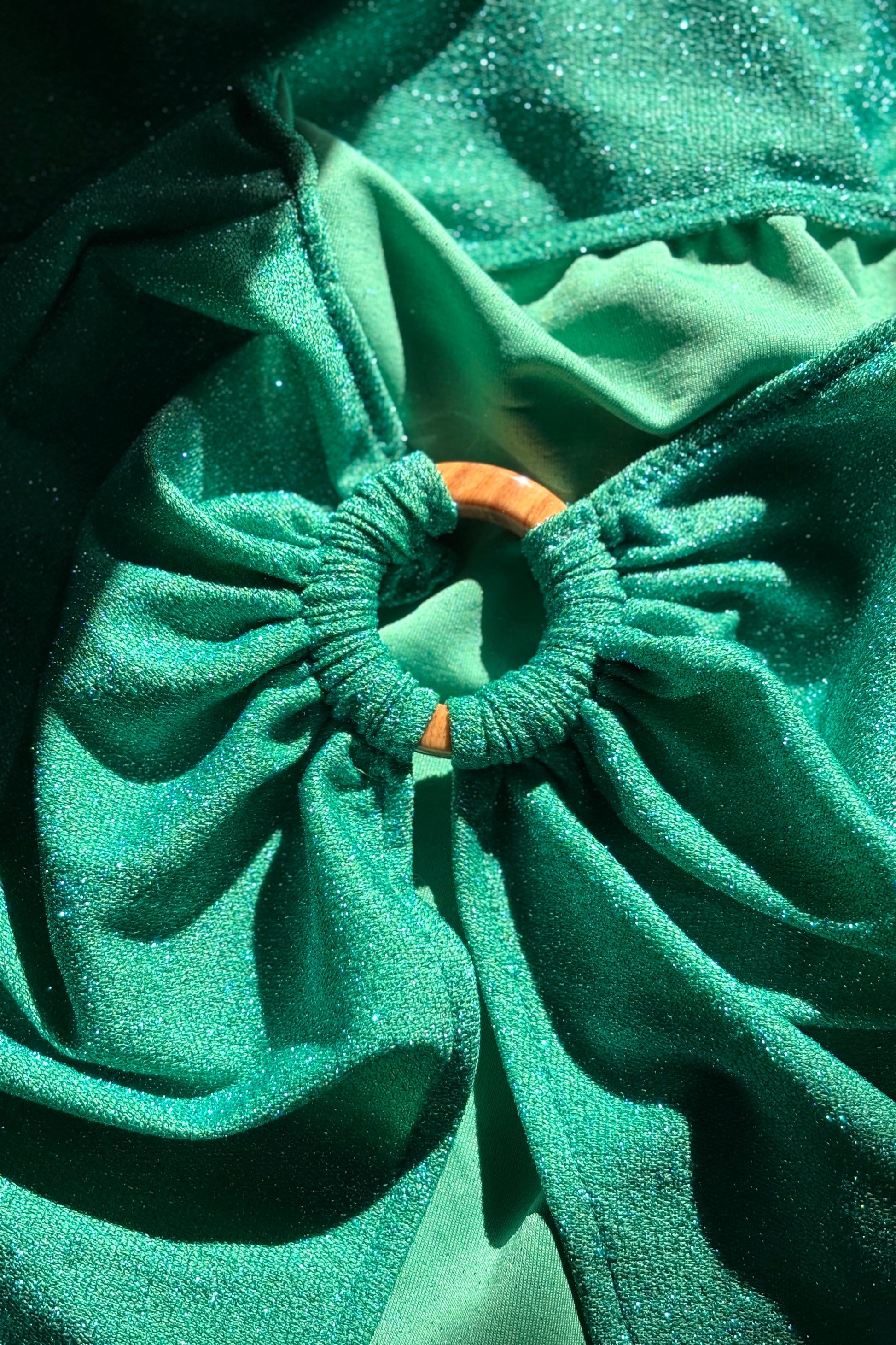 Nuestro bonito pareo Lenka esta confeccionado en un suave y espectacular tejido de lurex de color esmeralda. Tiene un original recogido de argolla de plástico lateral, en color madera.