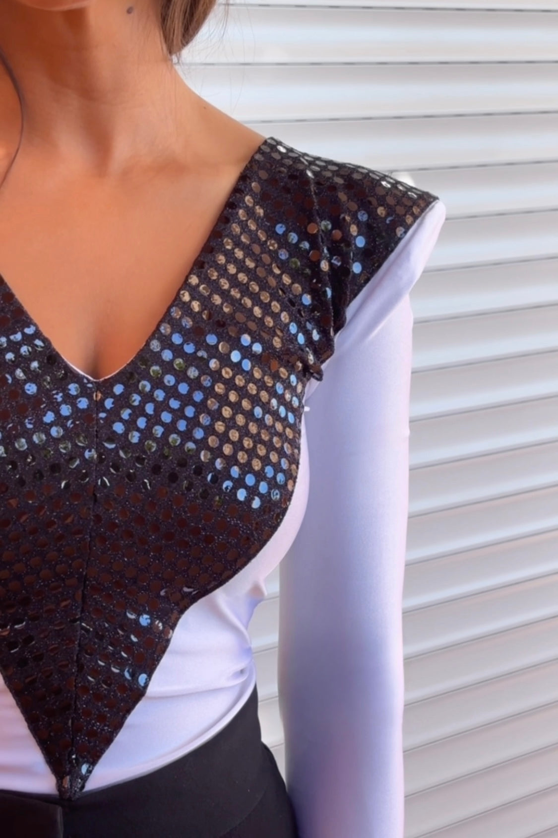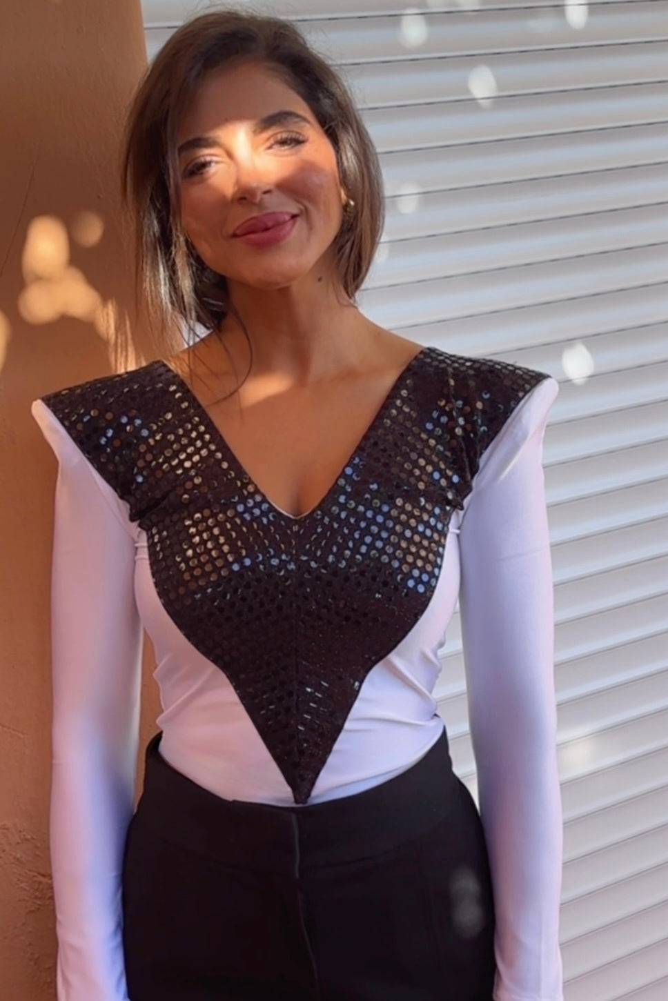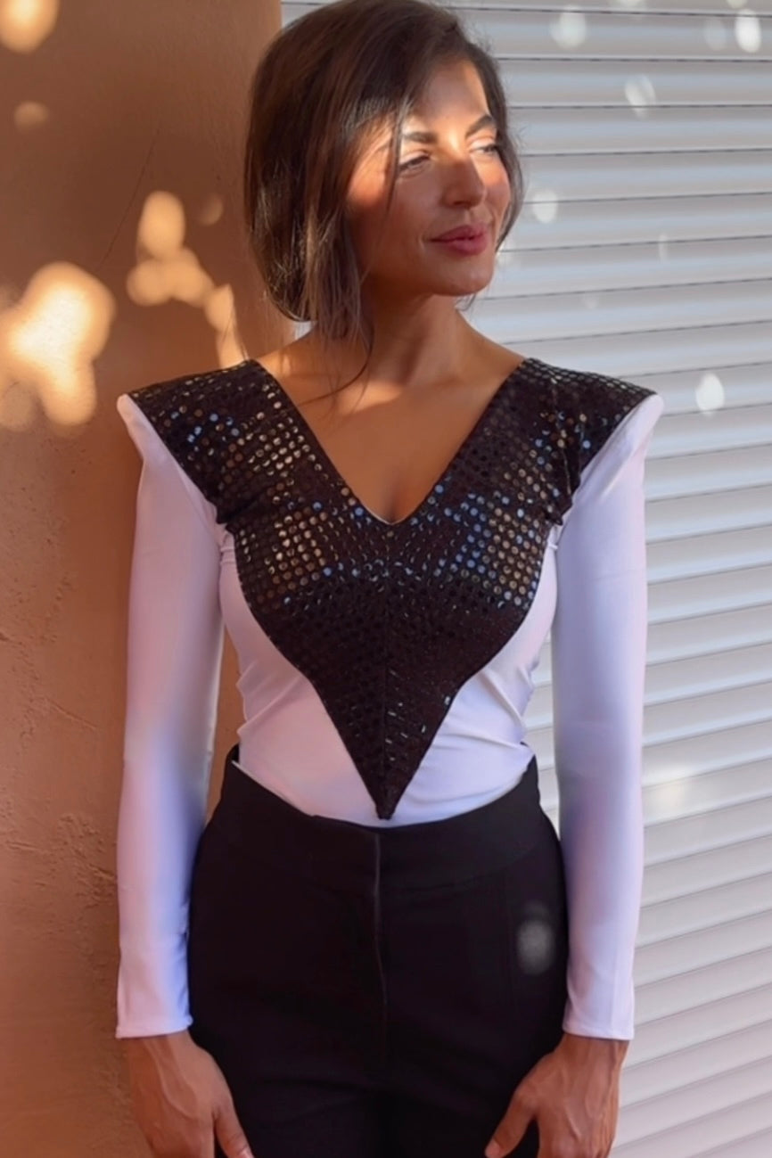 Nuestro top Love esta confeccionado en un bonito y elegante tejido de elastano en color blanco. Tiene un favorecedor escote en V de tejido negro de lentejuelas. Es un top entallado, de mangas largas, con maxi hombros y hombreras internas.