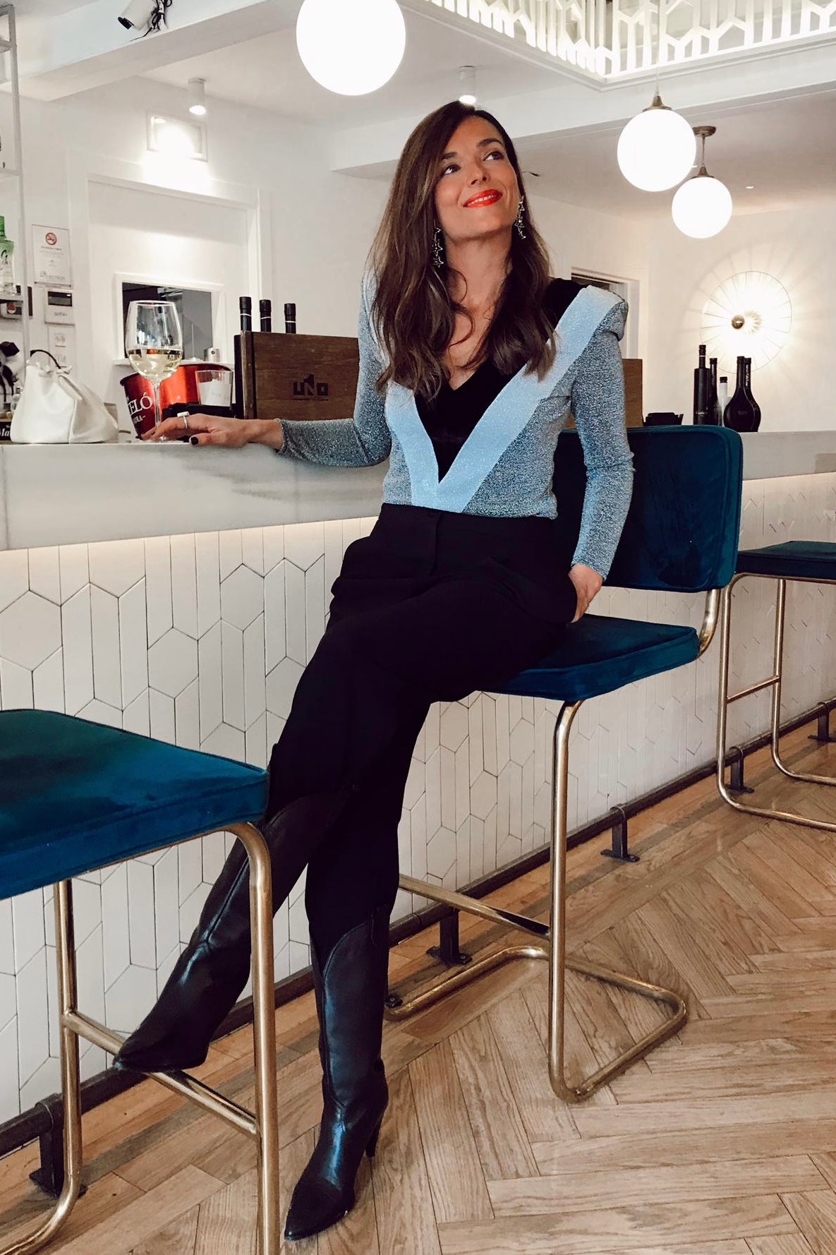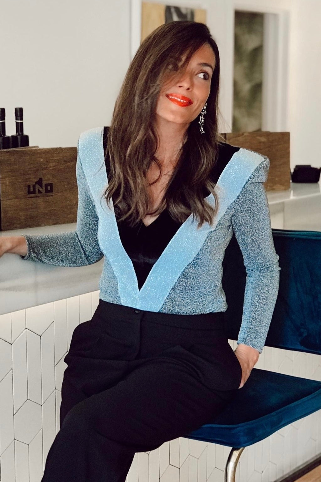 Nuestro top Love esta confeccionado en un bonito y elegante tejido lurex de fantasía de color plata. También disponible en web la versión dorada. Su base es de color plata oscura, tiene un espectacular y favorecedor escote en V de un suave y cálido terciopelo negro. Le acompaña un segundo motivo en V de tejido lurex en color plata clara. Es un top entallado, de mangas largas, con maxi hombros y hombreras internas. Su espalda es ligeramente transparente de color negro.