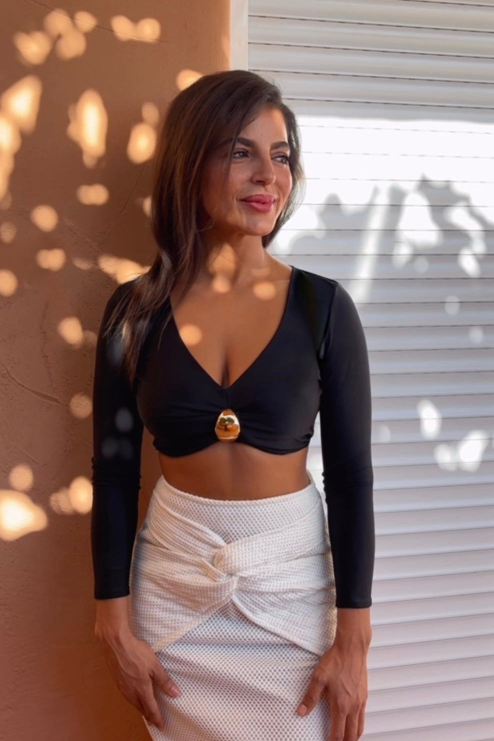 Nuestro top Adria esta confeccionado en un bonito y elegante tejido de elastano en color negro. Tiene un favorecedor escote en V cerrado con una espectacular piedra metálica de color dorado.