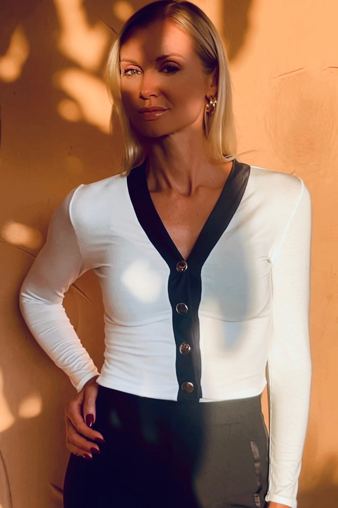 Nuestro top Nessa esta confeccionado en punto de algodón con micro fibras de seda, en color blanco. Tiene un bonito escote en V de color negro y botones dorados.