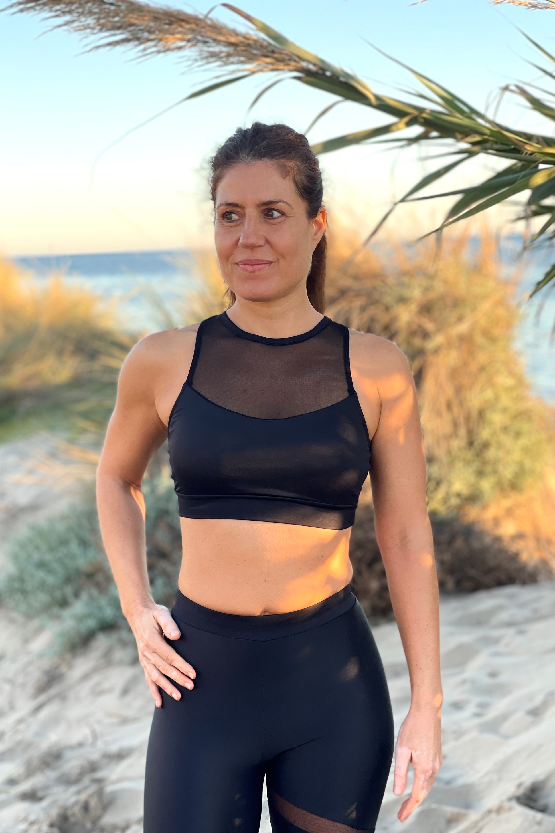 Tiene un top de licra blanca con escote redondo, unido a ello un top semi transparente de muselina negra con escote asimétrico, para una absoluta sujeción del busto con espalda deportiva.