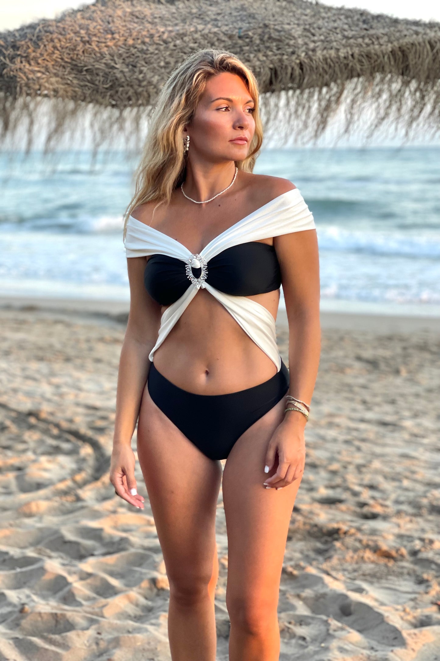 Nuestro trikini Mia está confeccionado en una suave y espectacular licra de color negro y blanco crema. Tiene un favorecedor motivo de metal con cristales plateados y tirantes al hombro. Gracias a la gran versatilidad de este diseño, podrá usarse bien como trikini o como body para tus mejores cenas de verano.